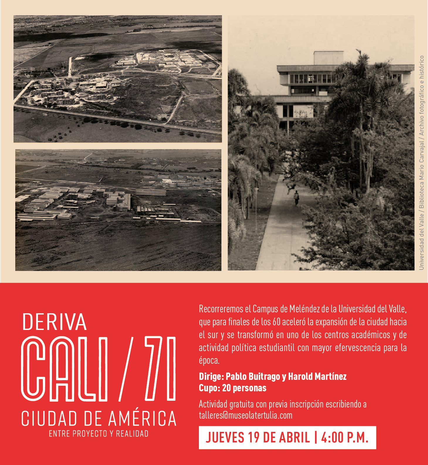 El Museo la Tertulia en alianza con la Escuela de Arquitectura de la Universidad del Valle, trae la II sesión de la serie Derivas, con la exposición "Cali 71, ciudad de América", la cual tiene como objetivo reconocer el proyecto de ciudad que tomó forma durante la década de los setenta en Santiago de Cali.