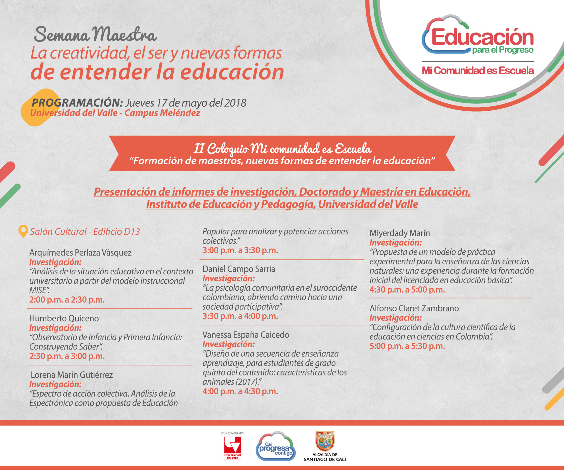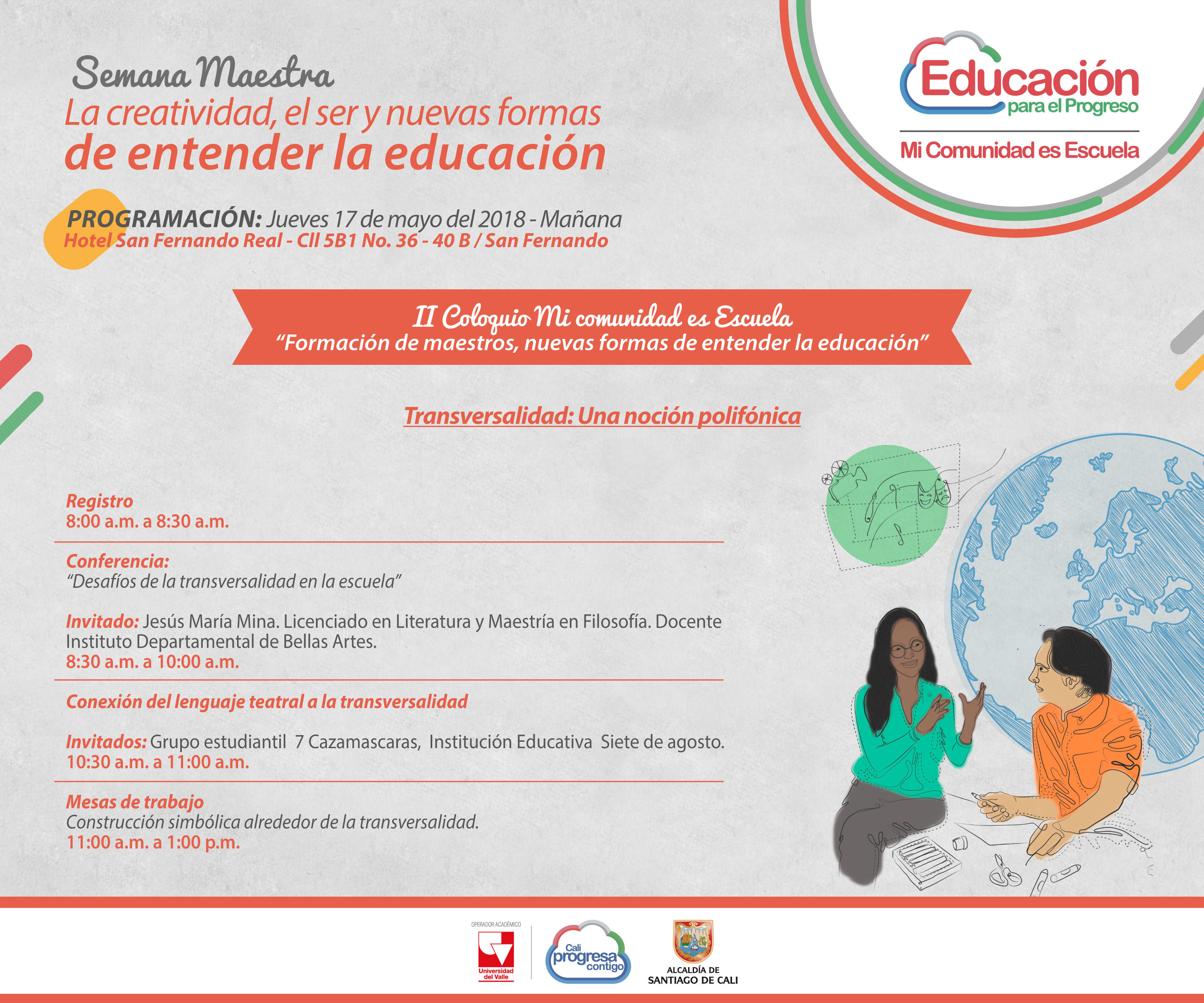 El programa Mi Comunidad es Escuela se une a la celebración del día del maestro con una semana dedicada a la formación en torno a lo educativo. El objetivo es acercar a los docentes y a la comunidad en general, a las posibles formas de ser, hacer y pensar en la escuela, en un intento por identificar otros saberes y prácticas pedagógicas que logren transformarla e influir positivamente en el ejercicio docente.