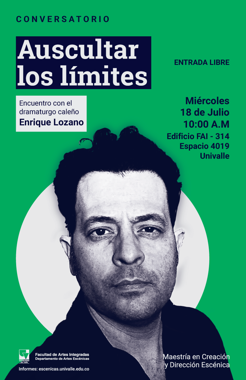 La Maestría en Creación y Dirección Escénica, adscrita al Departamento de Artes Escénicas de la Facultad de Artes Integradas de Univalle, invita a los estudiantes y egresados al conversatorio denominado: Auscultar los límites, a cargo del destacado dramaturgo caleño, Carlos Enrique Lozano, este miércoles 18 de julio, a las 10:00 am., en el Salón de la Maestría (Espacio 4019, edificio 314).