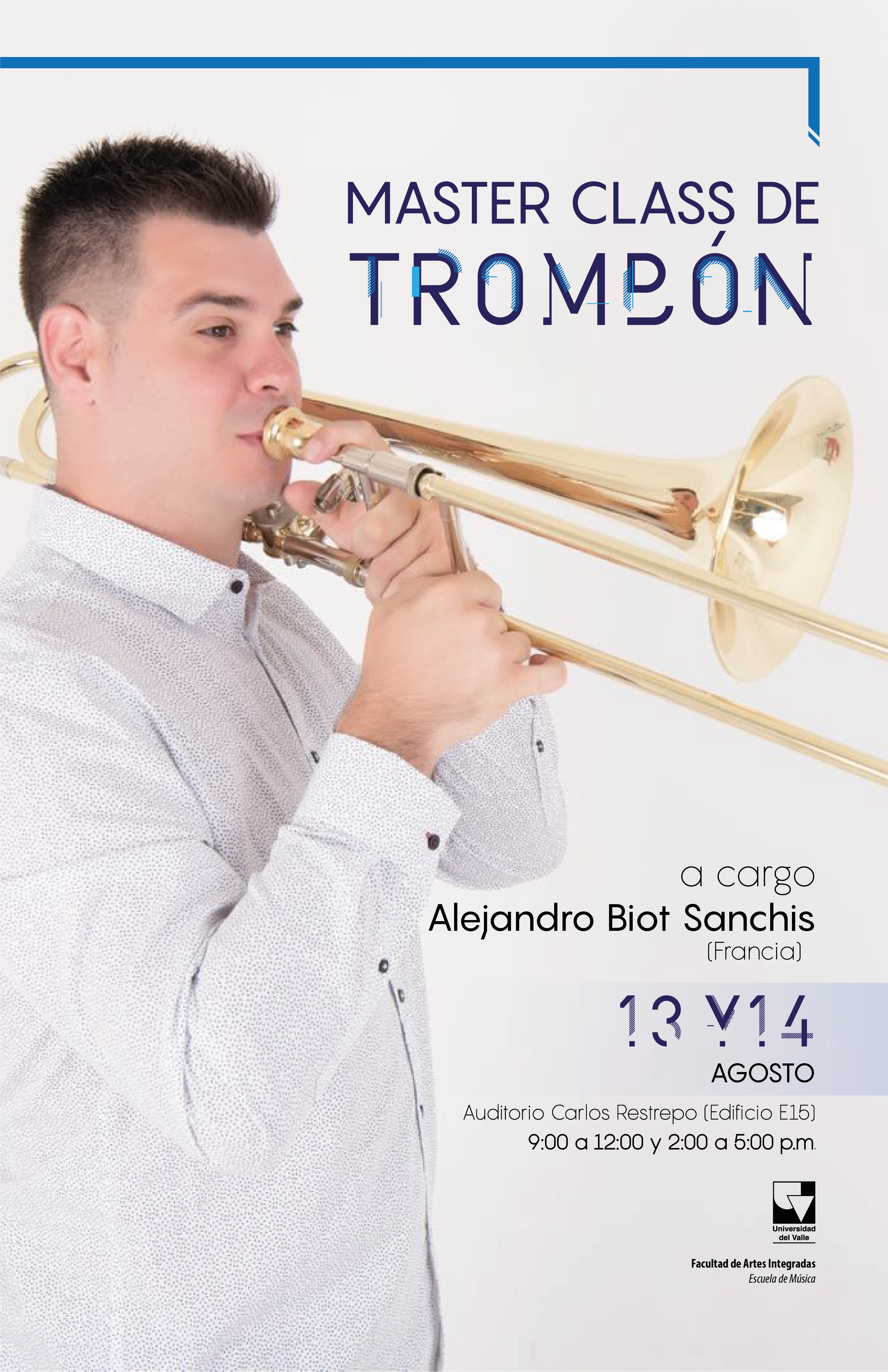 La Escuela de Música invita a la clase magistral en trombón con el español Alejandro Biot Sanchis, que se realizará el 13 y 14 de agosto de 9:00 a.m.- 12:00 m. y de 2:00- 5:00 p.m., en el Auditorio Carlos Restrepo del edificio E15, sede Meléndez de la Universidad del Valle.