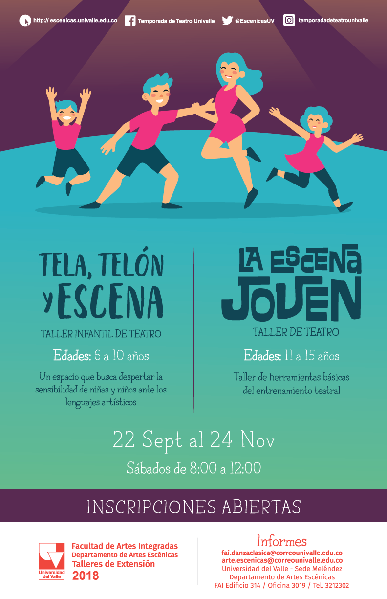 El Departamento de Artes Escénicas de la Universidad del Valle abre nuevamente las inscripciones para los talleres: Tela, telón y escena y La escena joven, que buscan despertar la sensibilidad ante los lenguajes artísticos en los niños y jóvenes, a partir de la lúdica y la articulación de diferentes prácticas artísticas. Los talleres son coordinados por profesores de nuestro Departamento.