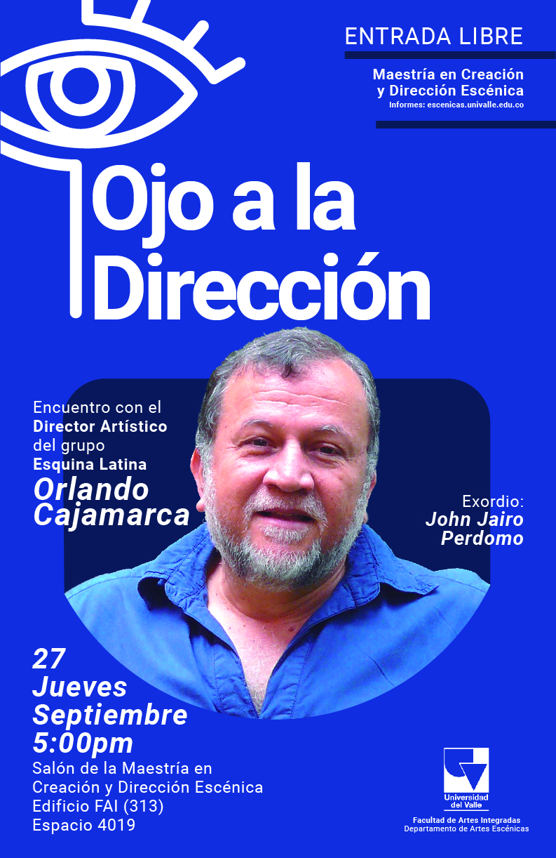 La Maestría en Creación y Dirección Escénica de la Universidad del Valle, organiza el primer ciclo de encuentros con creadores escénicos de reconocido impacto en la ciudad, denominado Ojo a la dirección, el cual busca profundizar el conocimiento de las prácticas escénicas en Cali. El encargado de abrir este ciclo de encuentros es el maestro Orlando Cajamarca, director del grupo Esquina latina, este jueves 27 de septiembre, a las 5:00 en los salones en la Facultad de Artes Integradas de Univalle.