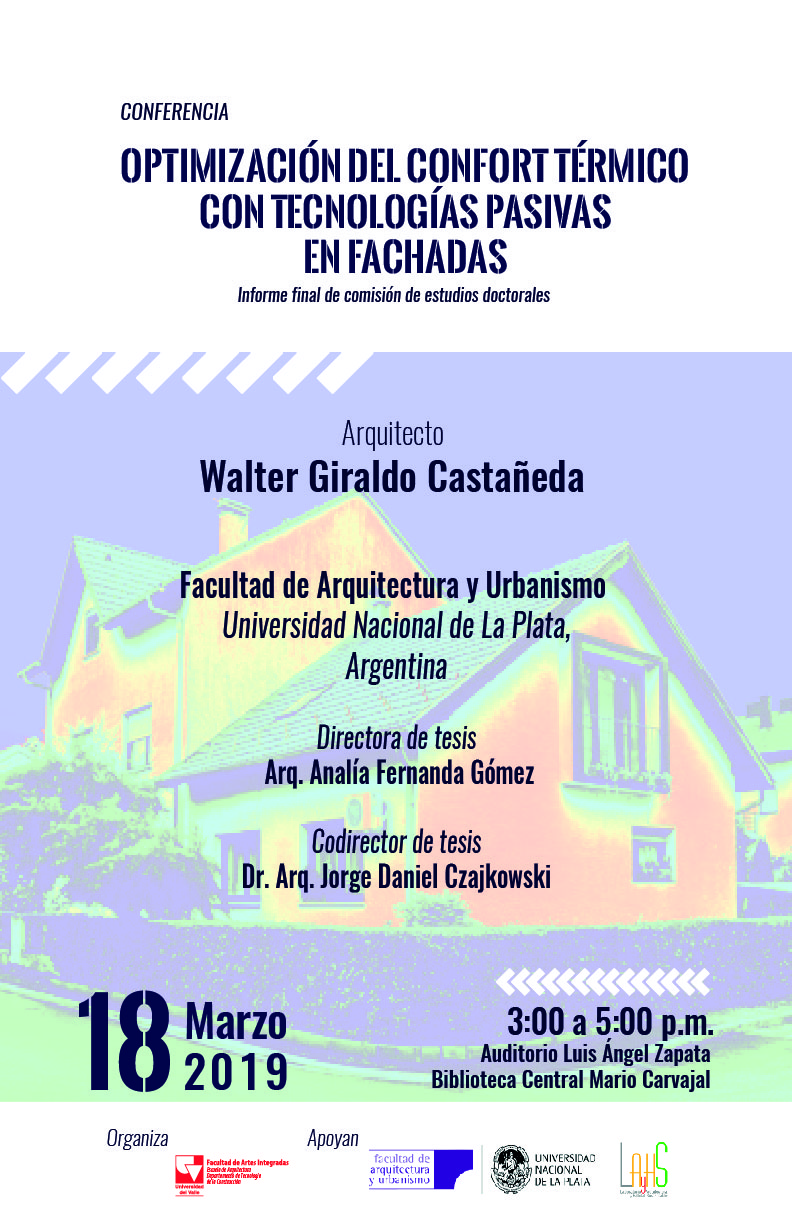 La Escuela de Arquitectura de la Facultad de Artes Integradas invita a la conferencia “Optimización del Confort Térmico con Tecnologías Pasivas en Fachadas” a cargo del Profesor Walter Giraldo Castañeda, que se realizará el próximo lunes 18 de marzo en el Auditorio Ángel Zapata Ceballos de la Biblioteca Mario Carvajal a las 3:00 p.m.
