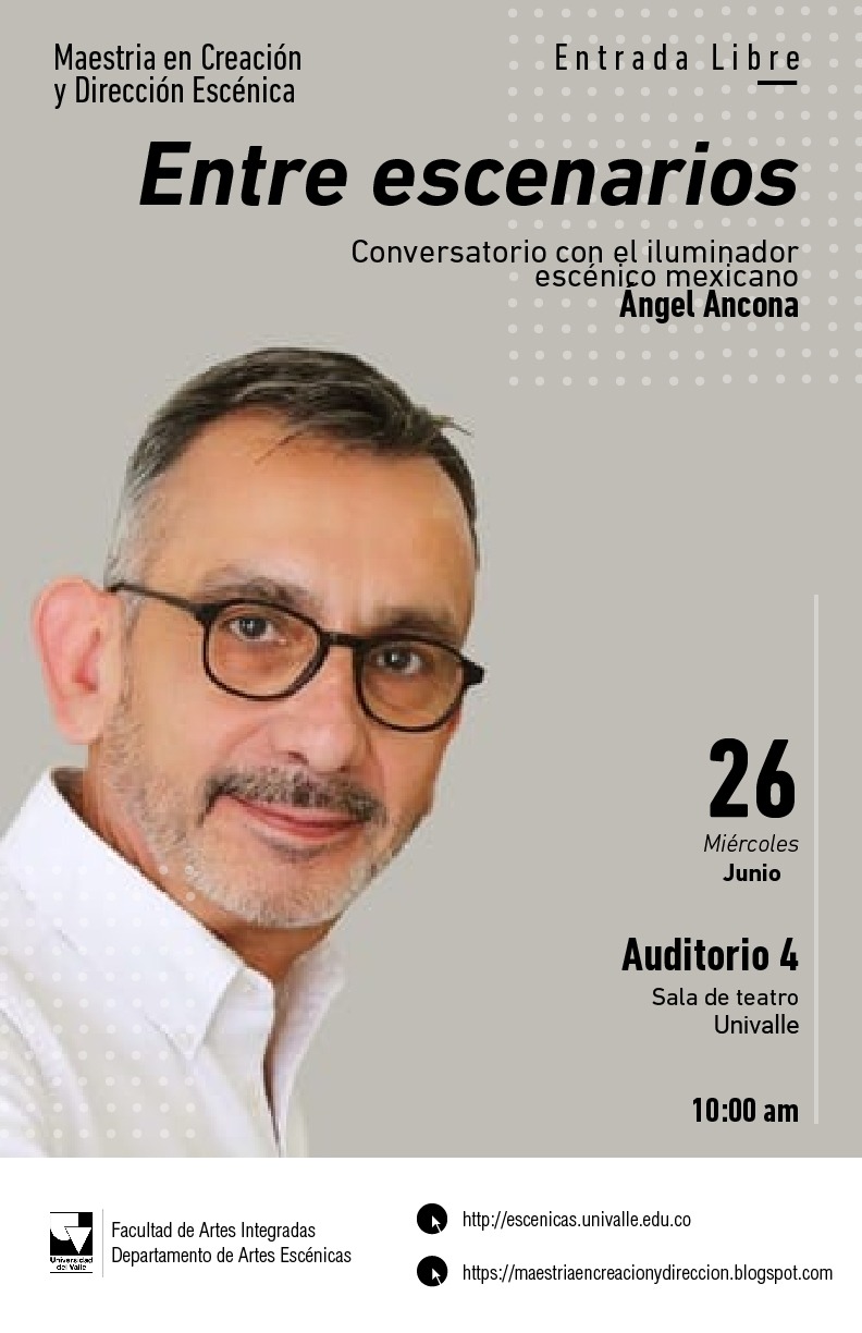 La Maestría en Creación y Dirección Escénica, adscrita al Departamento de Artes Escénicas de la Facultad de Artes Integradas, dentro del ciclo de encuentros con importantes maestros, invita a los estudiantes y público en general al conversatorio denominado “Entre escenarios” con el diseñador de luces Ángel Ancona, coordinador del Sistema de Teatros de la Secretaria de Cultura de la Ciudad de México, el miércoles 26 de junio, a las 10:00 am., en la Sala de teatro Univalle.