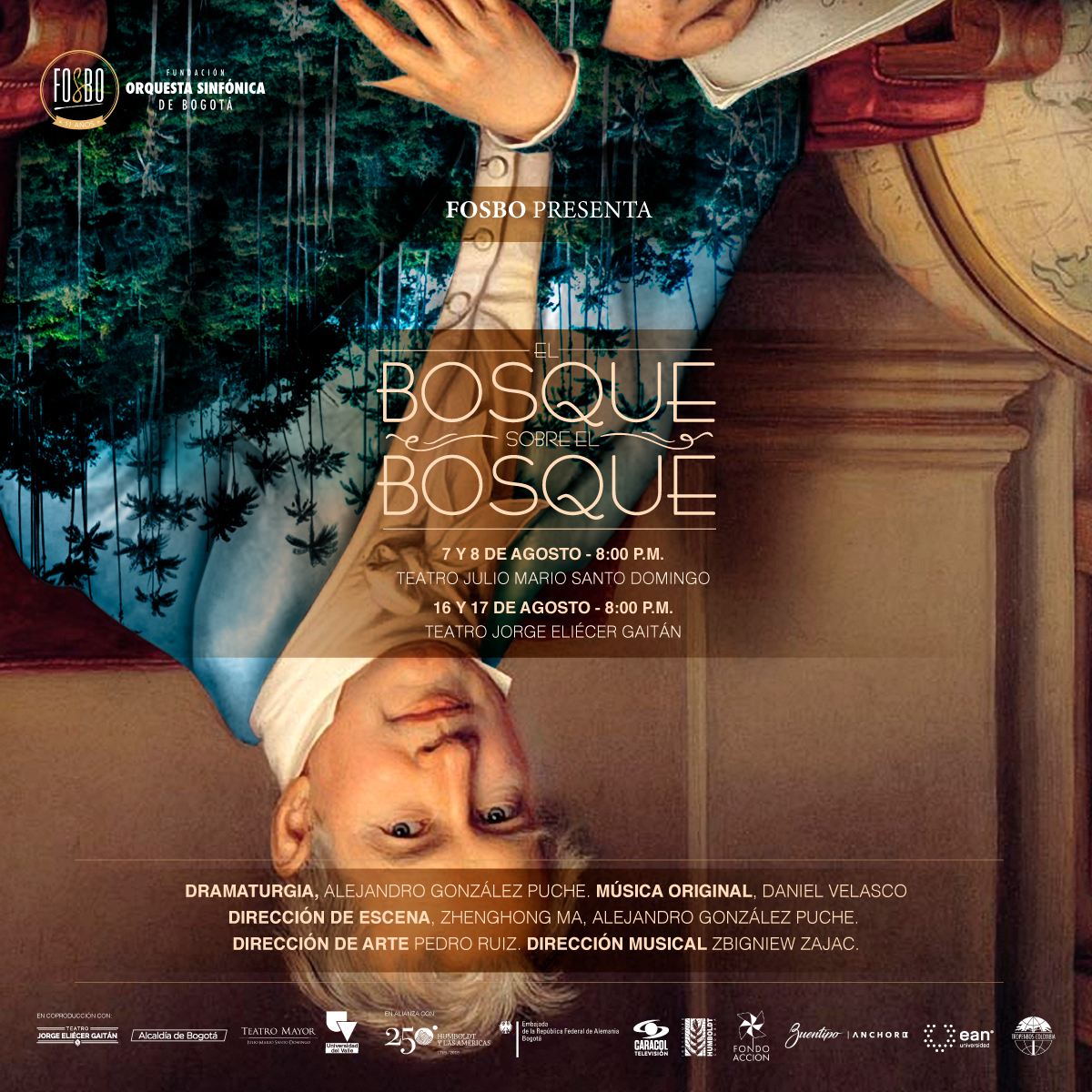El proyecto es posible gracias a la CONVOCATORIA INTERNA PARA PROYECTOS DE CREACIÓN ARTÍSTICA Y HUMANÍSTICA de la Universidad del Valley a la Beca de Creación Multidisciplinar del IDEARTE. El bosque sobre el bosque y reúne un equipo de más de 60 artistas en escena, proveniente de Colombia, Alemania, China, Polonia e Inglaterra
