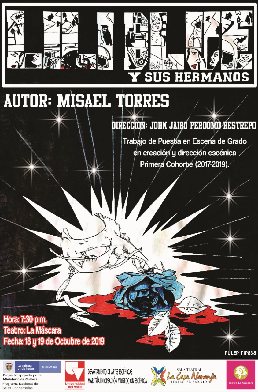 Lili Blue y sus hermanos es una creación escénica a partir de la obra del dramaturgo y director colombiano Misael Torres, la cual recoge el drama surgido de la historia de una mujer que vive una historia de amor en medio de un mundo decadente, rodeado por la violencia. Bajo la dirección de John Jairo Perdomo cuenta con reconocidos actores y actrices de la escena caleña como Karol Tatiana Cardona, José Fener Castaño, Nilson Moreno, Julián Correa, Andrés Holguín, y los noveles actores, Kelly Johana Perdomo, Luz Amparo Castillo, Rafael Arce, Eider Alexander Rubio, Ingrid Tatiana Celis Lemus, Cristian Díaz Villa y Camila Bedoya. Diseño de Vestuario Lina Marcela López, coreografías de Katja Kut - Eider Rubio. En coproducción con la Corporación Casa Naranja y el apoyo del Ministerio de Cultura de Colombia y su Programa Nacional de Salas Concertadas y la Gobernación del Valle y su Programa de Estímulos a la Creación.