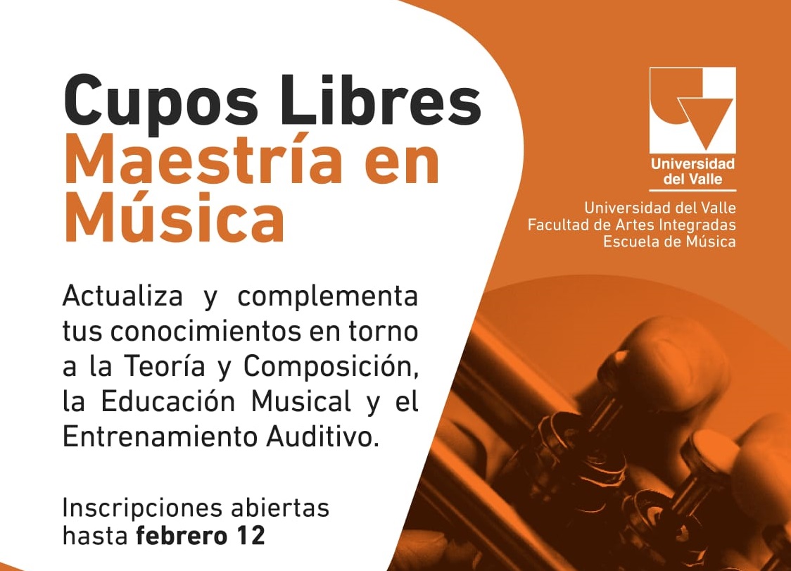 El 13 de febrero la Maestría en Música de la Universidad del Valle, único programa postgradual en su campo de la región, iniciará la formación de su primera cohorte de estudiantes. Con la intención de ofrecerle a los profesionales que no se encuentran matriculados en el programa, la oportunidad de actualizar y complementar sus conocimientos, la Maestría ofertará en la modalidad de Cupos Libres 3 seminarios: