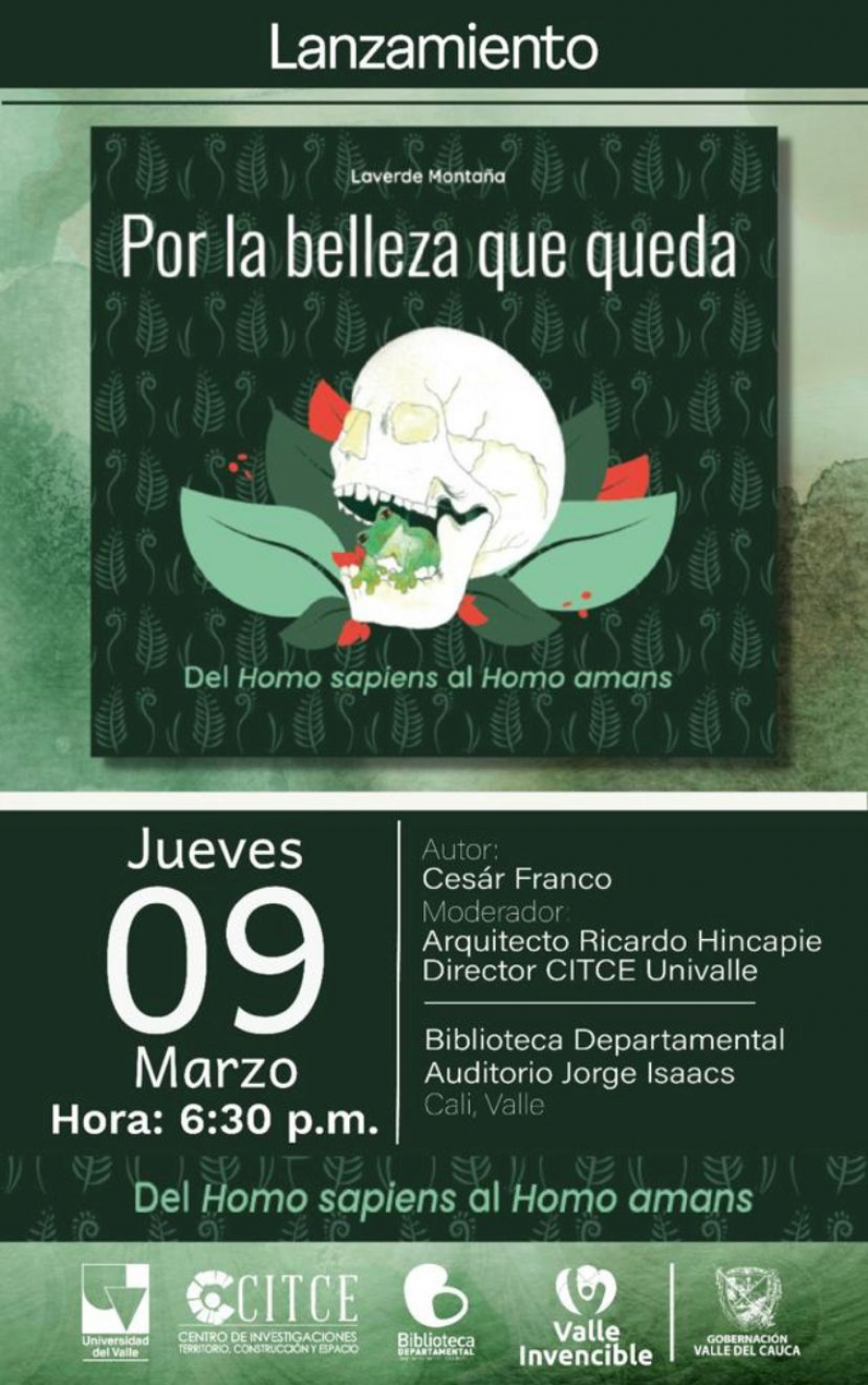 Este jueves 9 de marzo de 2023 el Centro de Investigaciones Territorio Construcción y Espacio -CITCE, de la Facultad de Artes Integradas de la Universidad del Valle, presentará el libro “Por la belleza que queda” de nuestro egresado de Ingeniería Química César Franco, quien a través de Serraniagua, Organización Ambiental Comunitaria, se ha dedicado a conservar los paisajes del municipio de El Cairo, en el Valle del Cauca.