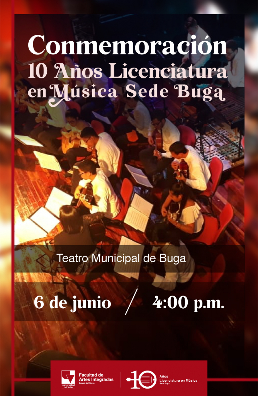 El próximo 6 de junio el Programa de Licenciatura en Música de la Universidad del Valle- Sede Buga celebrará sus 10 años. El acto protocolario tendrá lugar en el Teatro Municipal de la Ciudad Señora de 4:00 a 6:00 p.m. y espera contar con la participación de toda la comunidad universitaria.