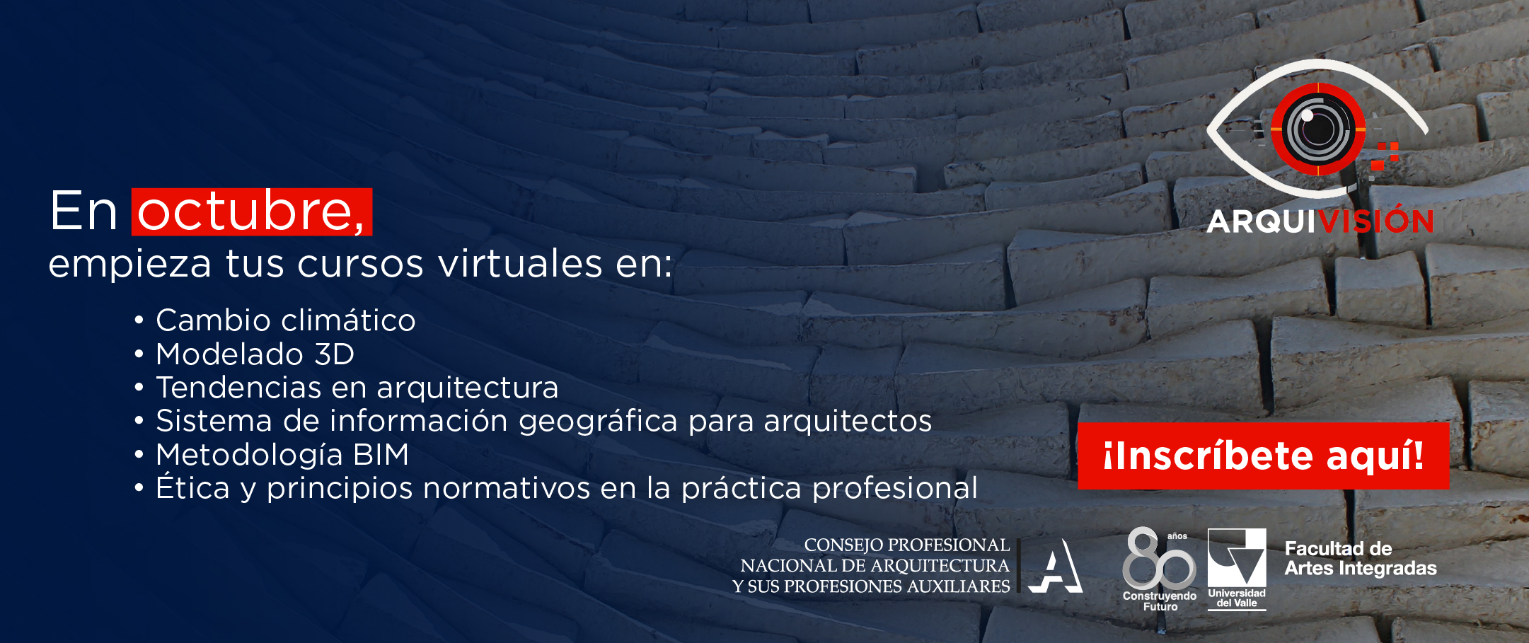 La Escuela de Arquitectura de la Universidad del Valle, en articulación con el Consejo Profesional Nacional de Arquitectura y sus Profesiones Auxiliares (CPNAA), invita a participar en los módulos de autogestión del programa ARQUIVISION, una iniciativa de educación continua orientada a fortalecer las competencias de los profesionales del campo de la arquitectura frente a los desafíos contemporáneos del entorno construido.