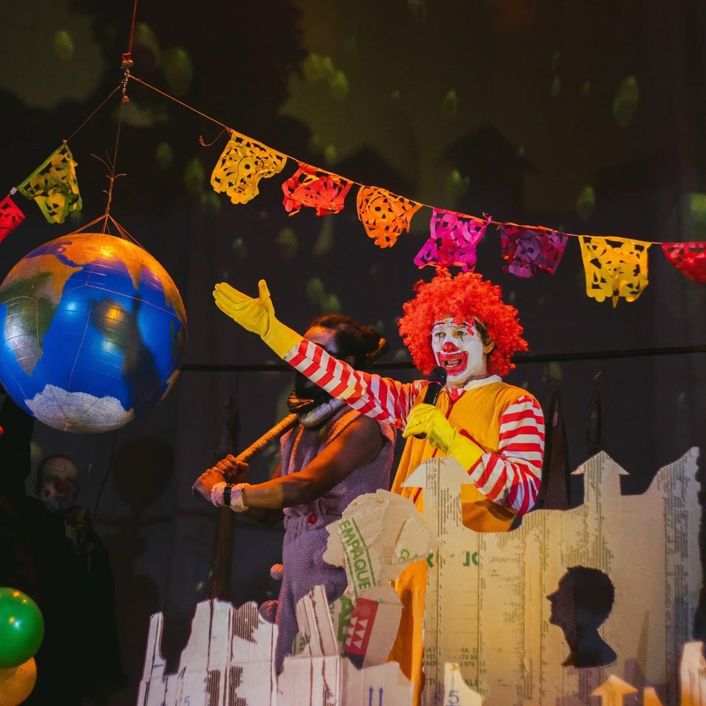 La Obra: Una comedia distópica que convierte la catástrofe global en una carcajada colectiva. En un mundo al borde del colapso, la humanidad baila entre ruinas mientras personajes circenses subastan oxígeno, fe y nostalgia. La pieza utiliza elementos contemporáneos como el mapping, el karaoke y la fe digital para exhibir los restos del poder y el consumo como reliquias de un pasado que se desmorona. Es el último ritual antes del silencio: una fiesta que sigue hasta el último estallido.