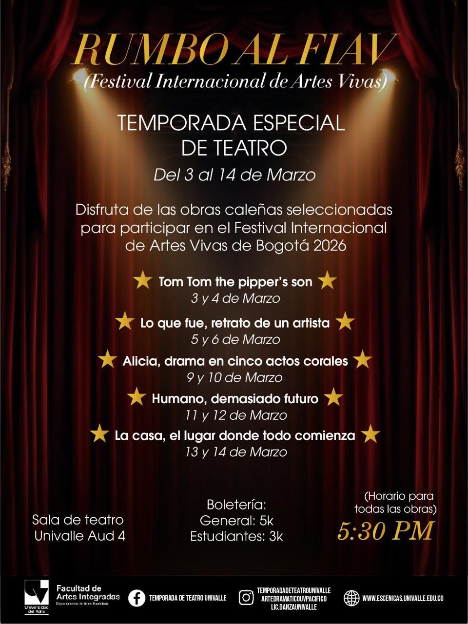 Esta temporada es una oportunidad única para disfrutar del alto nivel creativo que nos representará en la capital. Invitamos a la comunidad universitaria y caleña a disfrutar de estas obras que llevan la voz de nuestra región al FIAV Bogotá 2026.