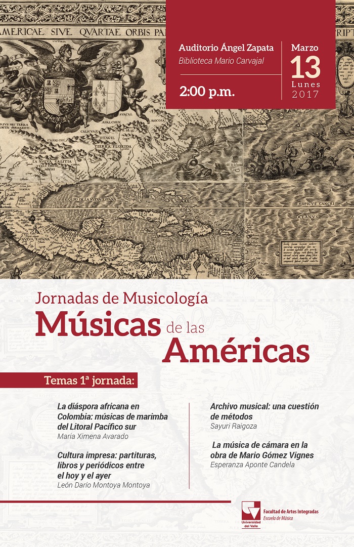 Este lunes 13 de marzo de 2:00 p.m. a 4:00 p.m en el auditorio Ángel Zapata de la Biblioteca Mario Carvajal, se llevará a cabo la jornada de Musicología: las músicas de las Américas, actividad coordinada por la Escuela de Música de la Facultad de Artes Integradas.