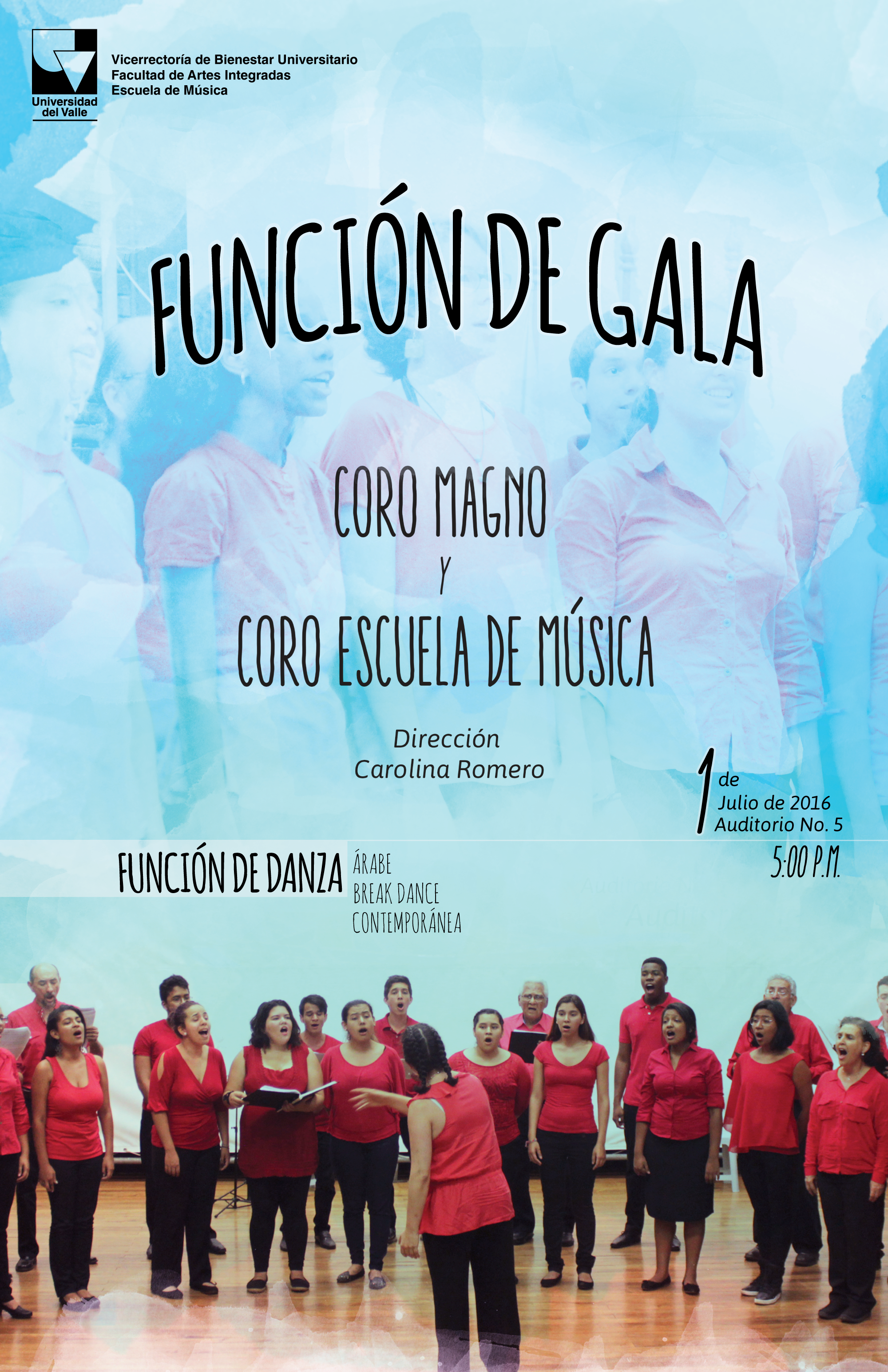 Con función de gala el Coro Magno y el de la Escuela de Música presentan el repertorio del semestre académico Marzo-Julio de 2016 en una jornada cultural que invita también a los grupos de danza coordinados por Vicerrectoría de Bienestar Universitario: break dance, árabe y contemporánea. La actividad se realizará el viernes 1 de julio a las 5:00 p.m. en el auditorio 5 del campus Meléndez.