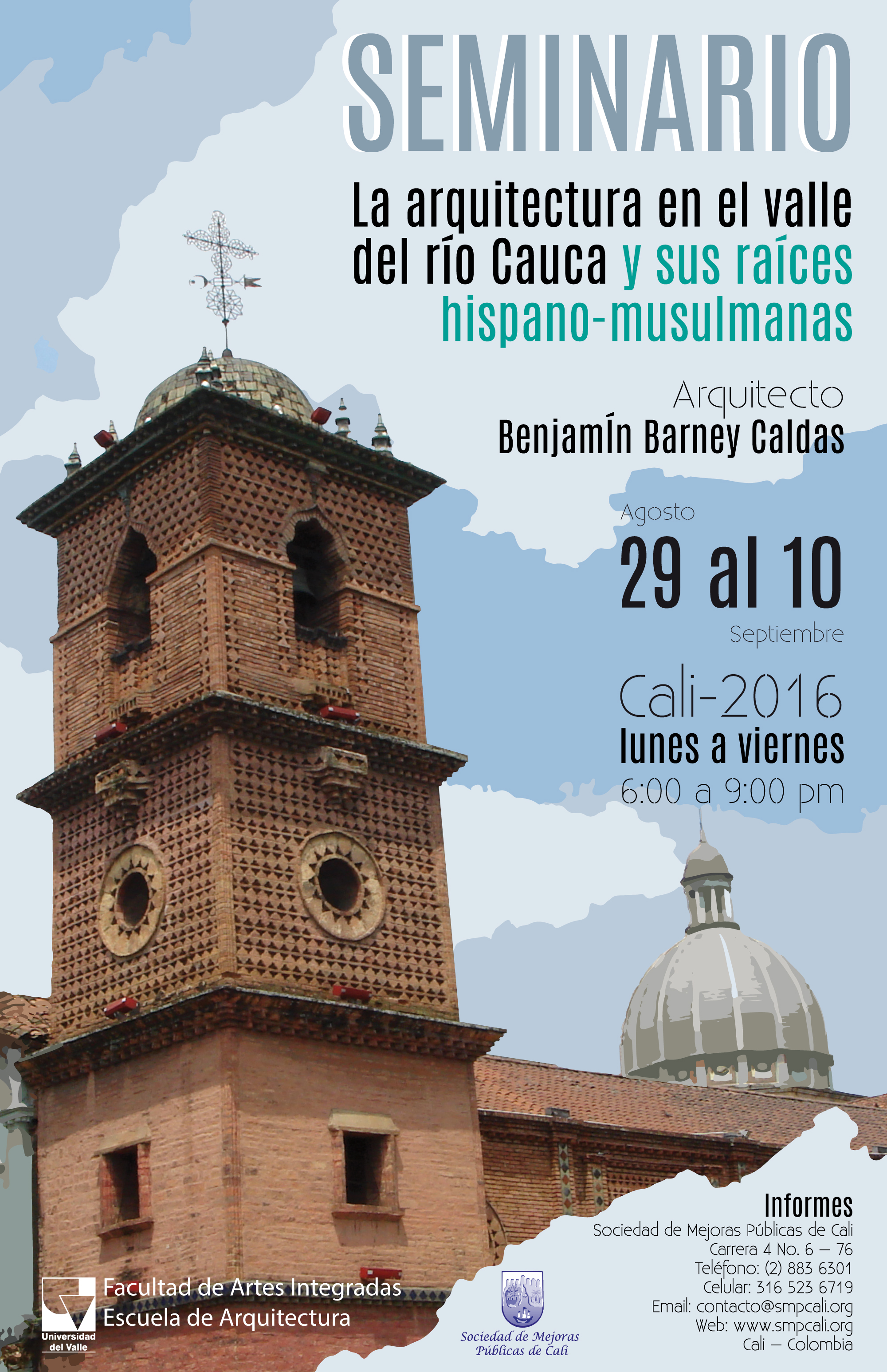 La Sociedad de Mejoras Públicas y la Escuela de Arquitectura de la Universidad del Valle invitan a profesionales y estudiantes que estén interesados en conocer la relación de la arquitectura con las ciudades y el concepto de identidad que se construye alrededor de la estética arquitectónica para que se inscriban en el seminario “Ojo a la Comarca: La arquitectura en el valle del río Cauca y sus raíces hispano-musulmanas”.