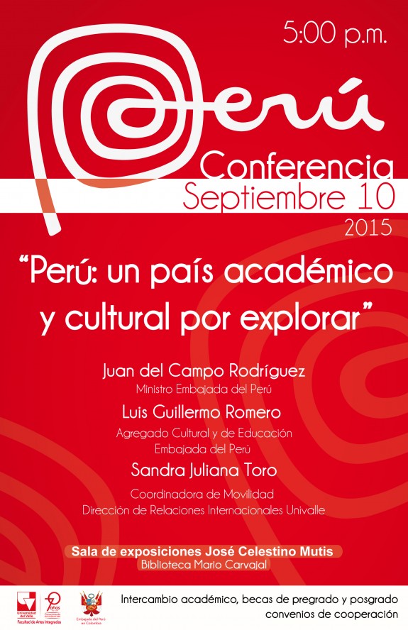 A las 5:00 p.m. en la Sala Mutis, el jueves 10 de septiembre se dictará la charla “Perú: un país académico y cultural por explorar” a cargo de la Dirección de Relaciones Internacionales de la Universidad del Valle y la Embajada del Perú. En esta charla se abordarán las opciones de movilidad e intercambio para estudiantes y docentes.